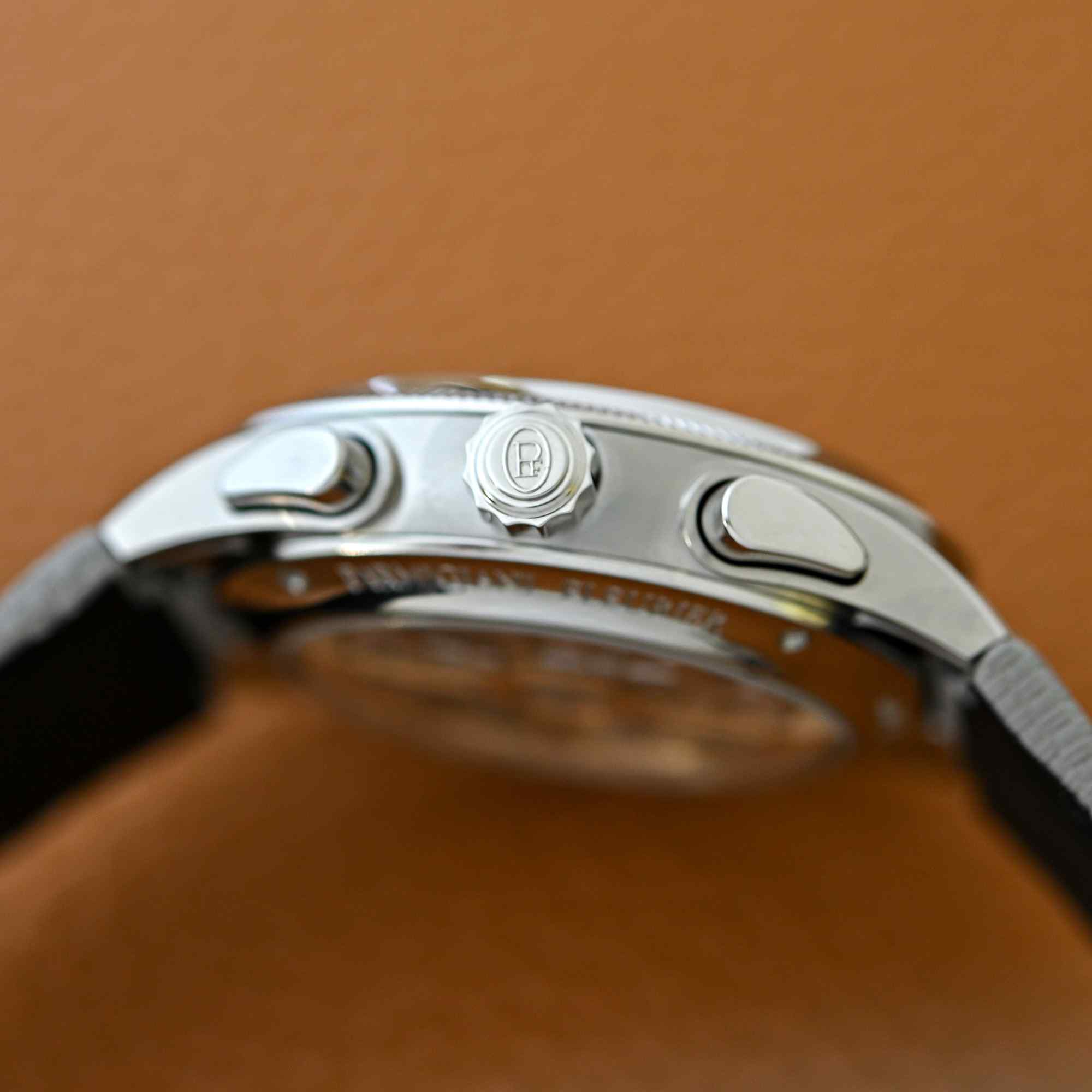 除了表盘之外,这三款全新的Tonda PF Sport计时码表均沿用了2023年款型号的基本特征,包括42毫米尺寸的精钢表壳,标志性的泪滴表耳以及滚花表圈。值得一提的是,它的表圈上拥有着160个切口,而不是像Tonda PF腕表那样有着225个切口,这就让它能够展现出更为大胆的光线和反射效果。